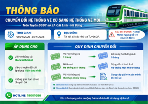 THÔNG BÁO VỀ VIỆC CHUYỂN ĐỔI VÉ HỆ THỐNG CŨ SANG VÉ HỆ THỐNG MỚI TRÊN TUYẾN ĐSĐT SỐ 2A CÁT LINH – HÀ ĐÔNGThời gian thực hiện: Từ ngày 01/4/2026 đến hết ngày 30/4/2026. Địa điểm thực hiện: Tại tất cả các nhà ga trên tuyến ĐSĐT số 2A Cát Linh - Hà Đông. Quy định chuyển đổi vé: • Áp dụng đối với vé hệ thống cũ chưa kích hoạt. • Việc chuyển đổi chỉ ... |