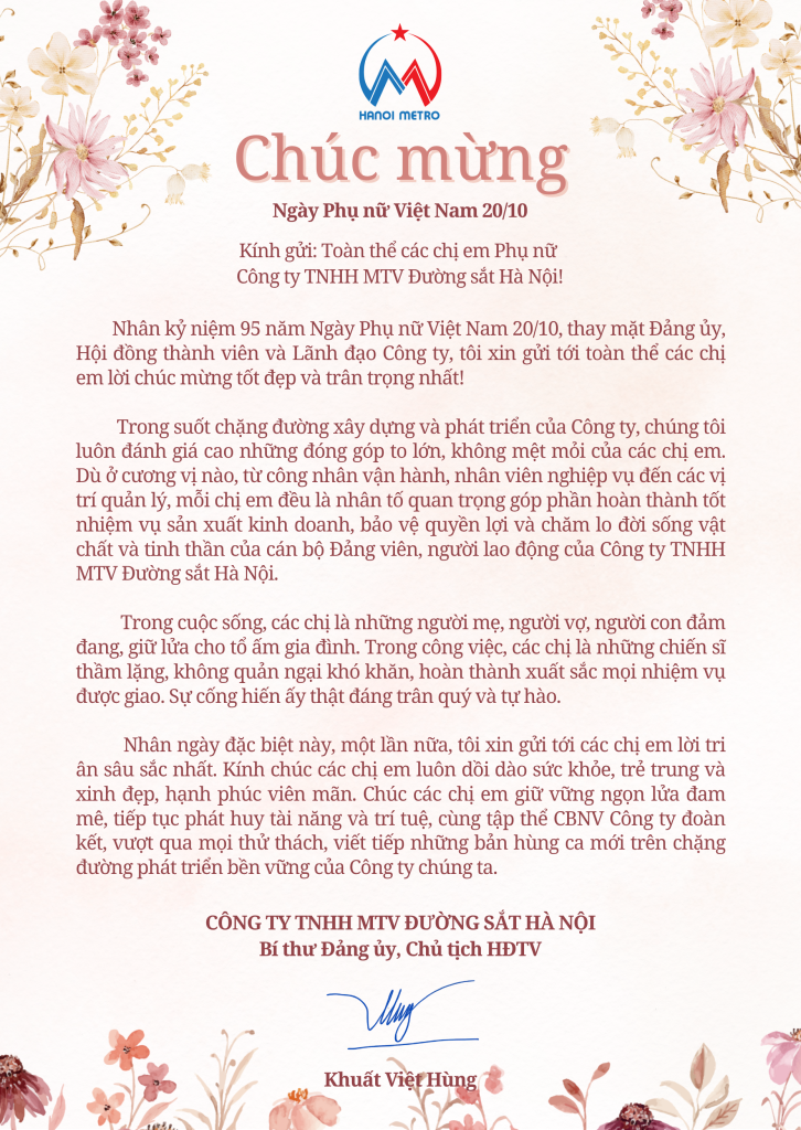 Nhân ngày đặc biệt này, một lần nữa, tôi xin gửi tới các chị em lời tri ân sâu sắc nhất. Kính chúc các chị em luôn dồi dào sức khỏe, trẻ trung và xinh đẹp, hạnh phúc viên mãn. Chúc các chị em giữ vững ngọn lửa đam mê, tiếp tục phát huy tài năng và trí tuệ, cùng tập thể CBNV Công ty đoàn kết, vượt qua mọi thử thách, viết tiếp những bản hùng ca mới trên chặng đường phát triển bền vững của Công ty chúng ta.
