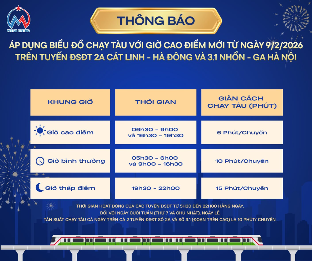 Nhằm đáp ứng tốt hơn nhu cầu đi lại ngày càng gia tăng của hành khách, đặc biệt trong các khung giờ cao điểm, Công ty TNHH MTV Đường sắt Hà Nội (Hà Nội Metro) trân trọng thông báo về việc điều chỉnh thời gian giờ cao điểm và áp dụng biểu đồ chạy tàu mới trên cả 2 tuyến ĐSĐT số 2A Cát Linh – Hà Đông và tuyến 3.1 Nhổn – Ga Hà Nội từ ngày 09/02/2026 như sau: